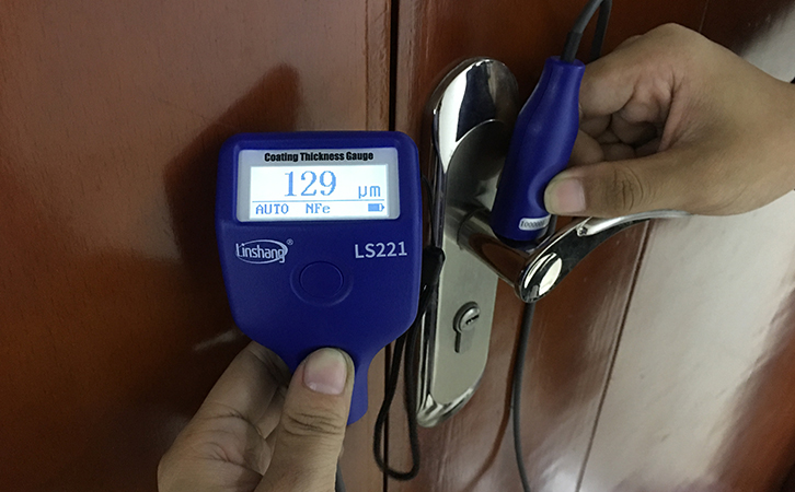 如圖所示,儀器測試的是門把的漆膜厚度。只要測量的區域位置大于25mm,漆膜測厚儀就可以測。