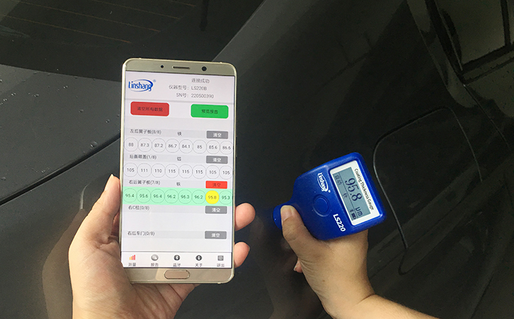 林上的這款藍牙漆膜儀LS220B和手機APP連接后,APP界面上自帶檢車的流程,可以在車頂、車門、發動機艙蓋等17個汽車部位欄目進行測試,操作非常的簡單方便。檢測完成后,APP可以生成測試報告,報告上會自動統計平均值,最小值,最大值等。可以更加客觀快捷地分析出二手車車漆厚度的整體狀況。