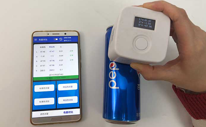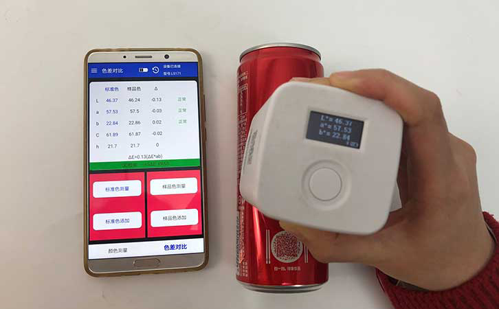 用色差儀對這兩個易拉罐的外觀顏色進行檢測后,色差儀連接的App顯示這兩個易拉罐的不同部位都是沒有色差的??煽诳蓸饭竞桶偈鹿镜钠焚|把控還是不錯的。測量易拉罐這種圓柱形的樣品時,我們應該注意要用測量口完全覆蓋住罐體,也就是要用色差儀緊壓在易拉罐表面,防止漏光。這款色差儀采用的是積分球的原理,體積小巧,有顏色測量和色差對比兩個功能。色差儀價格也十分優惠,是一款適合顏色測量并且經濟適用的精密顏色測量儀器。