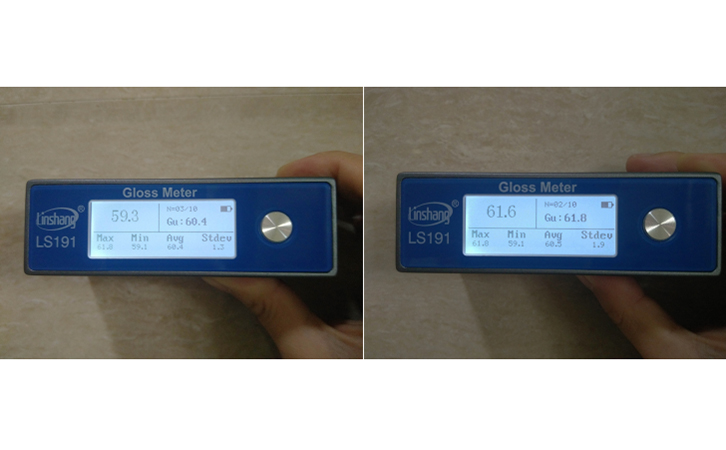 我就拿著便攜式光澤度計LS191,親自測瓷磚發圖給他們看: