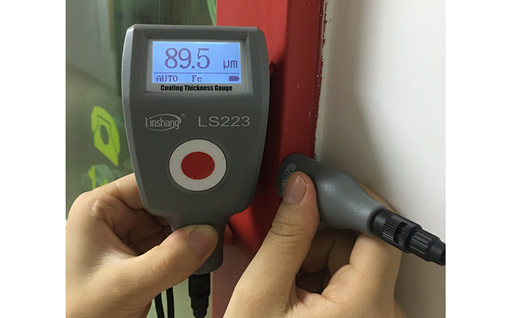 分體式鍍層測厚儀LS223,在自動識別的模式下,可以自動識別基底材料,并且自動轉換測量的模式,保證了測量數據準確性。下面就實測了消防栓邊框金屬鍍層的厚度是89.5μm。儀器只有一個按鍵,操作非常簡單。