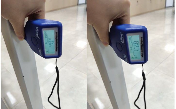 首先使用高精度涂層測厚儀標(biāo)配的調(diào)零板調(diào)零,這款儀器無需繁瑣校準(zhǔn),調(diào)零就能測。再將儀器探頭垂直按壓在金屬桌腿上,如圖左邊所示,儀器屏幕顯示Fe測量模式,是因?yàn)閮x器識(shí)別到被測材料是鐵基。識(shí)別之后,再將儀器提起來,再次垂直按在桌腿上,即可測出它的涂層厚度。