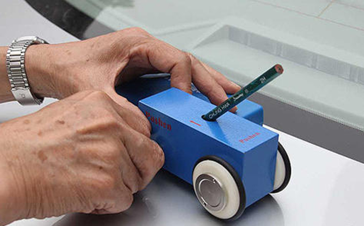 漆面硬度的測試非常簡單,主要是使用不同硬度的鉛筆來進行測試,鉛筆的硬度由6B到9H不同等級,最硬的是9H,最軟的是6B。筆與車漆成46度角進行測試,用相同強度型號的筆反復刮劃五道,如果有兩道以上的漆膜未被劃傷則換用前一位鉛筆硬度更高標號的鉛筆進行測試;如果劃破兩道或兩道以上的鉛筆,記下這個鉛筆硬度的標號,將此標號后一位硬度標號作為該漆膜的硬度,對于汽車等高檔面漆,要求鉛筆硬度小于等于H級。