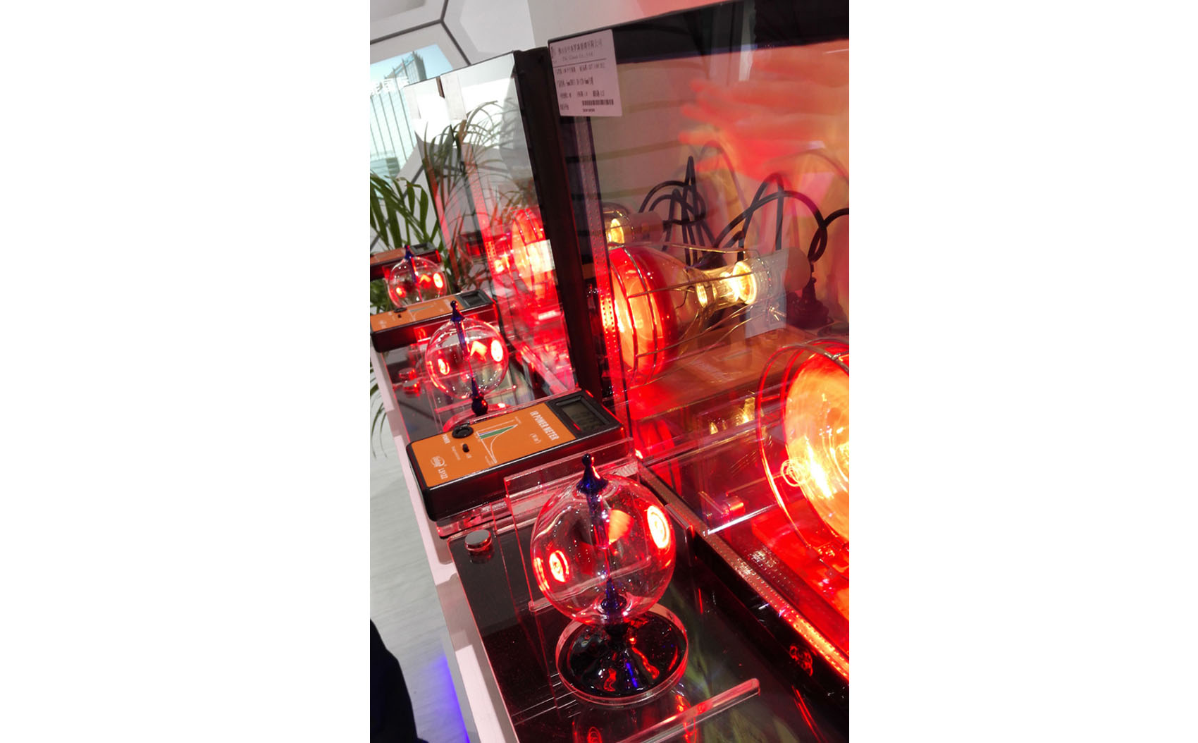 在廣州門窗幕墻展會上,發現了林上SK1250系列的隔熱演示套箱在門窗幕墻行業應用的身影,分別放入普通玻璃,單銀玻璃,雙銀中空玻璃,儀器的數據因為放入不同的玻璃顯示不同,光強魔鏡的轉速也會因為接收到不同的熱量轉速不一樣,完美地展示著客戶的產品。