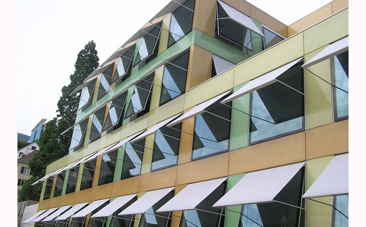 3.擋板遮陽,是在窗戶的前方離窗戶有一定距離設置離窗戶平行方向垂直的大遮陽板,能夠很有效地遮擋高度角較小從窗戶正方照射下來的陽光。 應用于窗口朝東、西及其附近朝向窗戶。但此種遮陽板遮擋了大部分視線和風,可做成百葉式或活動式的擋板。
