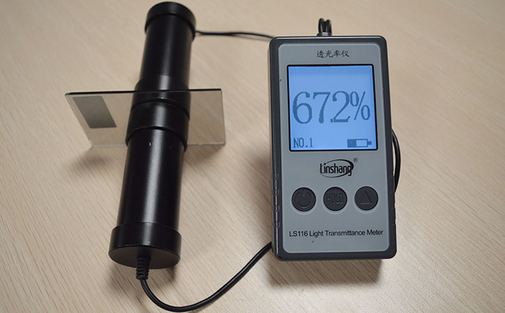 首先兩個探頭吸合,開機透光率顯示數據為100%后,兩個探頭夾著被測材料,對準測量,顯示的數據就是被測材料透光率的數值。