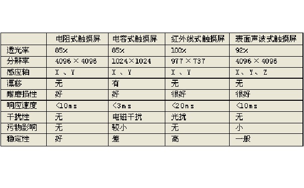 各種觸摸屏基本技術(shù)對照表