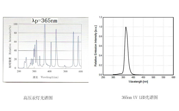 眾所周知,紫外固化用高壓汞燈在我國是有國家標(biāo)準(zhǔn)的,《QBT 2826-2006》膠印紫外光固化油墨國標(biāo),該標(biāo)準(zhǔn)中有規(guī)定:墨膜紫外固化條件:80W/cm2高壓水銀燈,照射距離15.5cm,速度64m/min。但是固化用的LED燈卻一直沒有出具國家標(biāo)準(zhǔn),很多企業(yè)還是在使用高壓汞燈專用的紫外能量計(jì)去測試LED光源,但是這種做法是非常不專業(yè)的。因?yàn)楦邏汗療艉凸袒肔ED燈的光譜曲線圖相差很多(見下圖),所以測試應(yīng)該使用固化用LED燈專用的紫外能量計(jì)。
