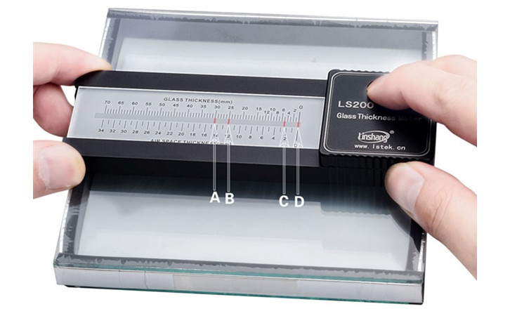 把玻璃測厚儀放置于中空玻璃的表面,按下電源開關并且保持不放,可見四條光線,其中D光條出廠時已經校準和零刻度線平齊,C光條在“玻璃厚度標尺(GLASS THICKNESS)”上的讀數即為第一層玻璃的厚度。在“玻璃厚度標尺”A光條的讀數減去B光條的讀數即為第二層玻璃的厚度,A = 30mm,B = 25mm,C = 5mm,D = 0mm。第一層玻璃的厚度為C – D = 5mm,第二層玻璃厚度為A - B = 5mm。